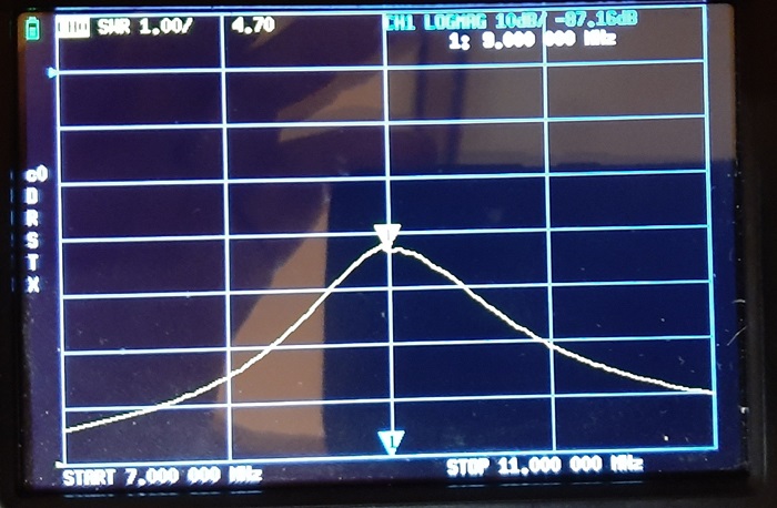 Robimy zatem ostatnie pomiary zgodnie z sugestią pomiar metodą odbiciową (SWR) i wnioski końcowe..., zrobiłem pomiary z obciążeniem tak jak ma pracować ten mieszacz (z diplexerem), ale też obciążyłem dla porównania diplexer filtrem kwarcowym SSB na 9MHz. Filtr kwarcowy jest dopasowany trafo 1:9 i zamknięty na wyjściu rezystorem 510R.