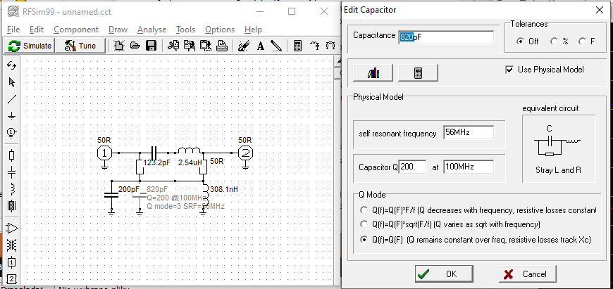 Niestety, kalkulator ogranicza dokładność obliczeń więc nie można idealnie dopasować wartości lecz wystarczająco dla tego przykładu. Co z tego wynika? Przyjęta dobroć obwodu (nie mylić z dobrocią komponentów) wynosi 2.87 co determinuje pasmo przenoszenia. Im mniejsza, tym szersze pasmo, to oczywiste. Ta z kolei wynika z konfiguracji i rzecz jasna jakości komponentów. Nie wdając się zbytnio w teorię, niejako intuicyjnie, możemy założyć, że głównymi winowajcami strat dla cewek będzie ich rezystancja, dla kondensatorów strata dielektryczna jednakże dla ogólnej jakości obwodu decydujące znaczenie będą miały właściwości często pomijane w rozważaniach (i praktyce też). Co mam na myśli? Właściwości ukryte w komponentach potocznie określane pasożytniczymi. O ich obecności możemy dowiedzieć się przyglądając się danym katalogowym producentów, którzy z oczywistych względów rzadko się nimi chwalą. A jaki wpływ mają na działanie układu? Za chwilę się o tym przekonamy.