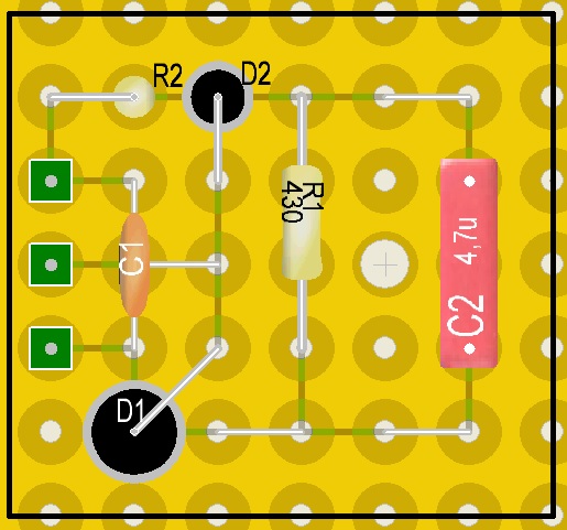 Wykonany został na jednostronnej płytce uniwersalnej o rastrze 2,54 mm, działa następująco: