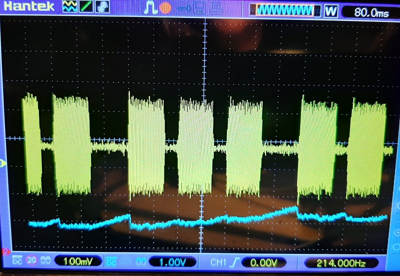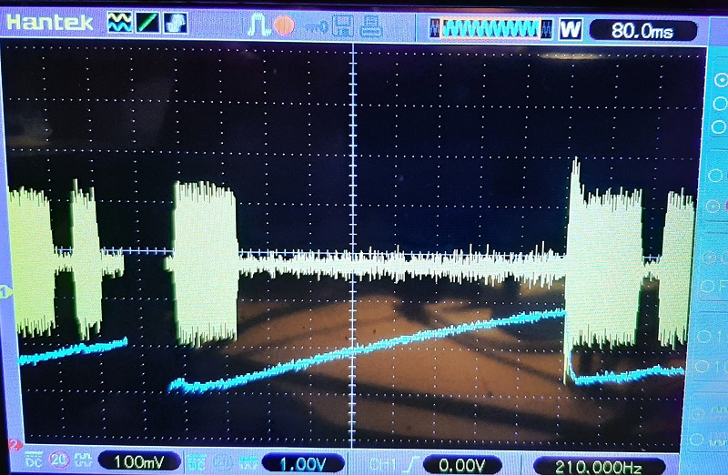 1. Sygnały CW z odbiornik p.cz. mosfety - sygnał u góry (żółty) i praca ARW na dole (niebieski).