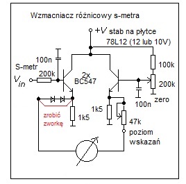 Poniżej schemat wzmacniacza różnicowego s-metra i pokazany problem na płytce.