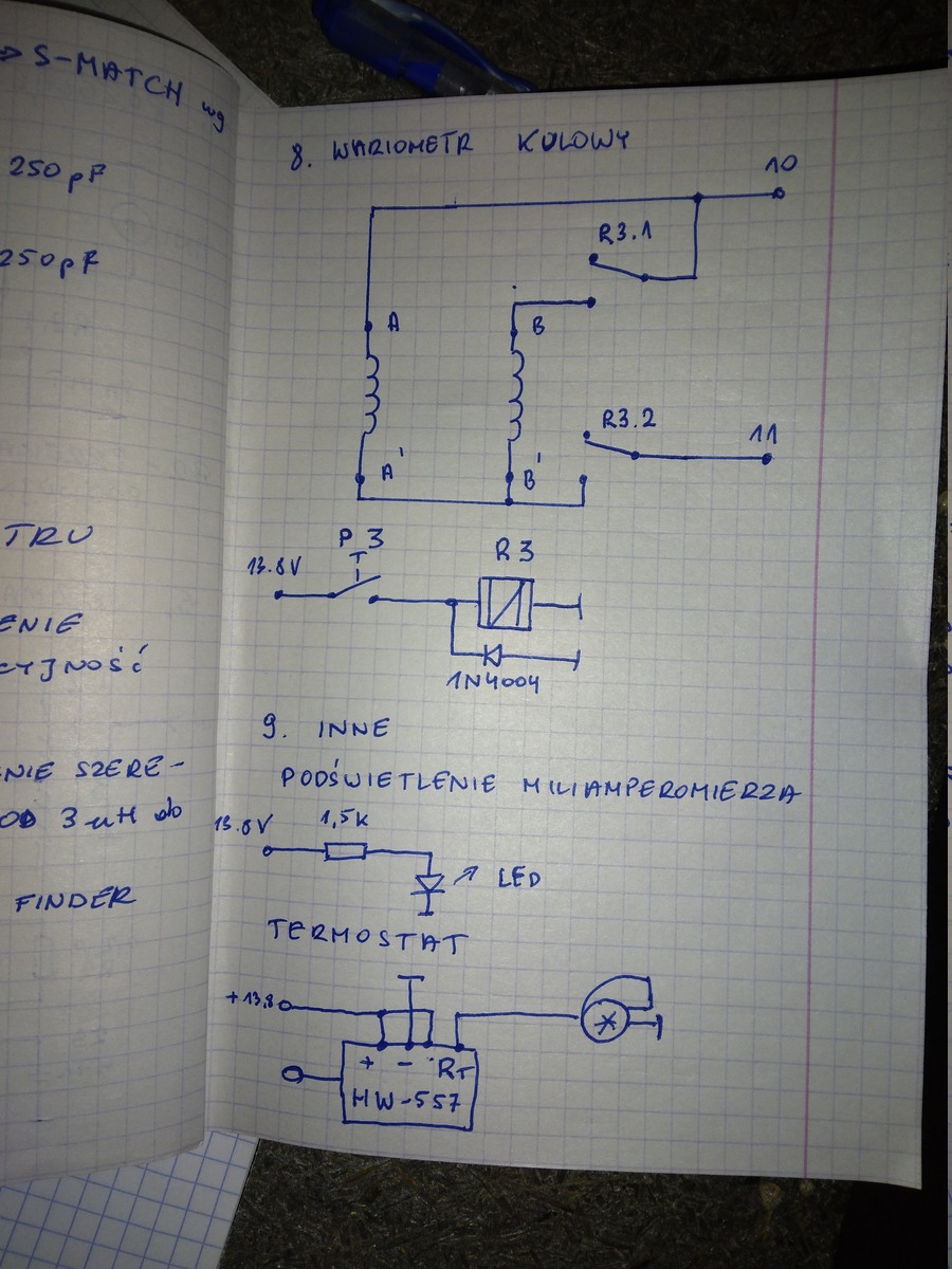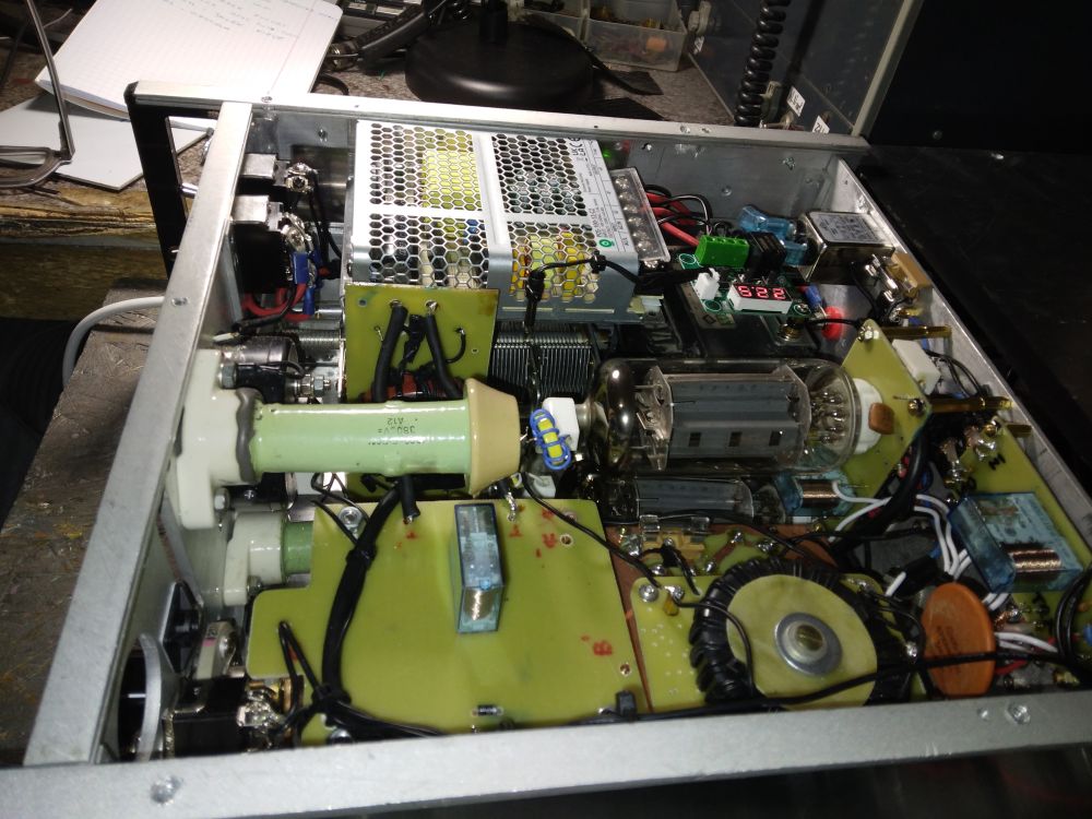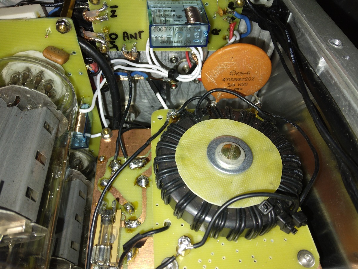 3.W trakcie pracy wzmacniacza , doszło do uszkodzenia przekaźnika Finder , przełączającego wariometr. Mianowice, podczas nadawania , w paśmie 80m , wariometr został omyłkowo przełączony na niską indukcyjność , czyli pasmo 20m. Skutkiem tego , powstało iskrzenie na stykach i plastikowa obudowa przekaźnika została nadtopiona, a przekaźnik został zablokowany. Problem usunąłem poprzez montaż podobnego przekaźnika marki Omron , ale pozbawionego plastikowej obudowy, na miejsce poprzedniego. Inny problem z przekaźnikiem nastąpił w przypadku przekaźnika przełączającym prąd spoczynkowy katod, czyli znowu przekaźnika Finder , umieszczonego pomiędzy dwoma lampami , który uległ nadtopieniu , po czym odmówił pracy. To był oczywisty błąd konstrukcyjny, ale wymuszony brakiem miejsca w obudowie. Na miejsce przekaźnika Finder , zastosowałem przekaźnik Omron , a zabezpieczyłem go oplotem aluminiowej folii spożywczej , przyklejonej do obudowy przekaźnika wysokotemperaturowym silikonem.Od tego czasu ów przekaźnik działa prawidłowo.
