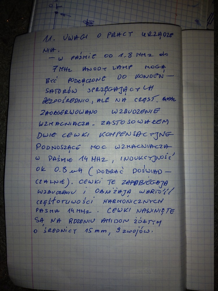 5. Doświadczalnie zbadano , że możliwa jest praca wzmacniacza , po odłączeniu jednej z lamp. Moc wzmacniacza spada wtedy o połowę. Jest to moim zdaniem dosyć przydatna obserwacja, mianowicie okazało się , że można wykonać wzmacniacz jednolampowy sterowany w katodzie lub siatce 1 , ale z zastosowanym obwodem dopasowania , który w przeciwieństwie do klasycznego pi filtra , znacznie ułatwia dostrojenie anteny .