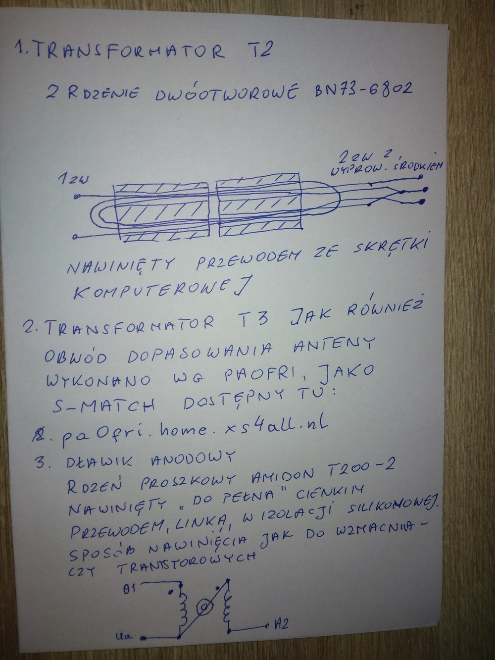 1.Wzmacniacz wykazuje się doskonałym dopasowaniem urządzenia sterującego ( transceivera ) i obciążenia , czyli impedancji wejściowej wzmacniacza. Klasyczny układ , czyli lampy pracujące równolegle i sterowane w katodzie , obciążają źródło sygnału sterującego, niską impedancją w jednym półokresie, a impedancją zbliżoną do nieskończoności w przeciwnym półokresie. Skutkuje to zazwyczaj buntem sterującego transceivera, albo gimnastyce , jak tą dziwaczną konfigurację dopasować, ażeby jakoś tam działała.Kiepskie dopasowanie wejścia skutkuje także występowaniem mocy odbitej , która obciąża tranzystory mocy transceivera , a także często powoduje produkcję zniekształceń intermodulacyjnyjnych , które następnie są wzmacniane. Ja proponuję Wam inne podejście do problemu.Ponieważ lampa 6545S cechuje się nachyleniem charakterystyki ok 20mA/V , rezystancja wejściowa tej lampy , pracującej w konfiguracji z uziemioną siatką , wynosi ok 50Ohm. Ponieważ steruję dwie lampy , zastosowałem transformator przeciwsobny jeden do jeden , czyli jeden zwój sterujący , i dwa kolejne , przeciwsobnie , sterujące poszczególne lampy.Tym sposobem transceiver widzi zawsze 50 Ohm.