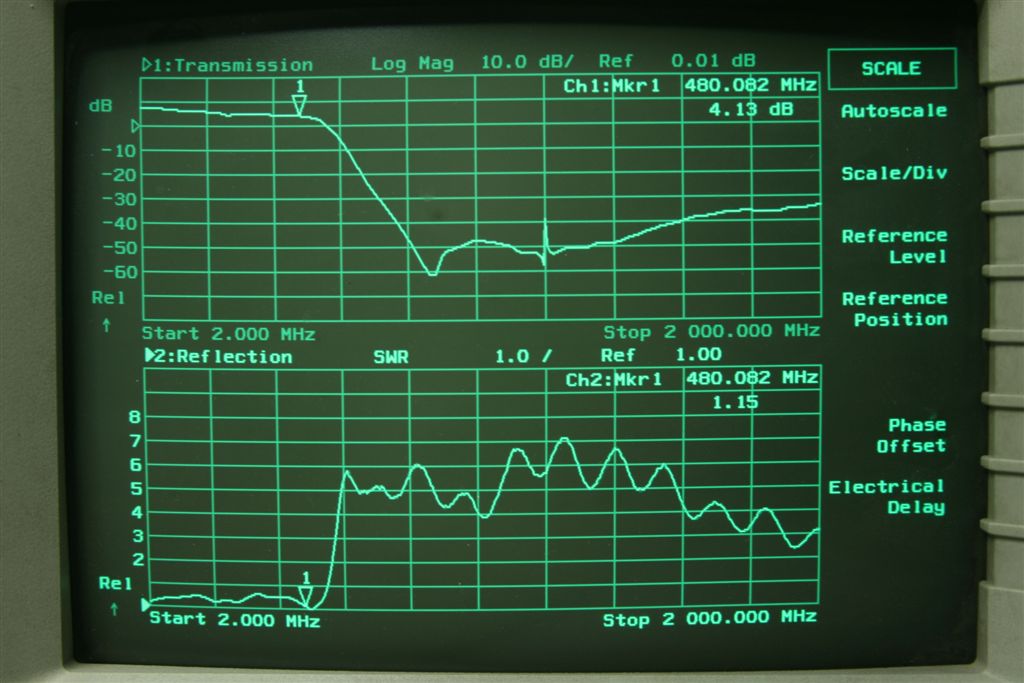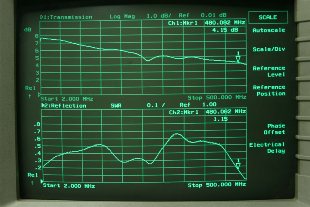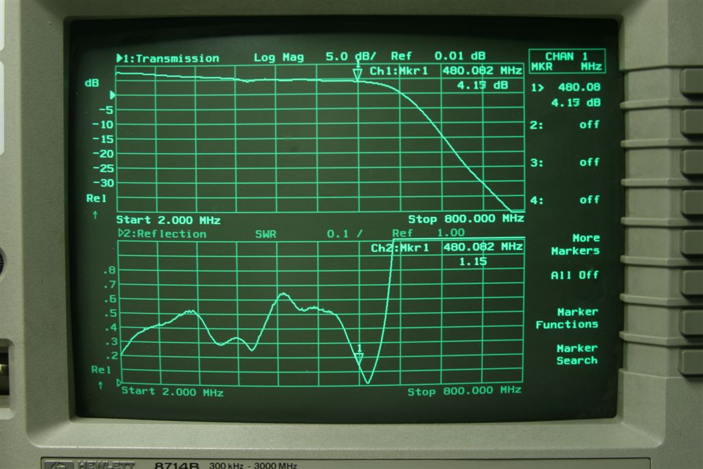 Na pierwszej fotce dopasowanie w paśmie przepustowym - SWR max 1,6 - myślę, że może być - w tym miejscu układu nie jest to najistotniejsze; na kolejnej tłumienie w paśmie zaporowym; na ostatniej zafalowanie w paśmie przepustowym. To nie jest duże, ale martwi mnie to, iż cha-ka opada od 2MHz do 480MHz o około 3,5..4 dB - nie wiem co o tym myśleć - w pierwszym momencie myślałem, że to kwestia ERy, ale wg pdf'a nie powinno być tam wiecej spadku niż dziesiąte części dB - czyżby jednak filtr?