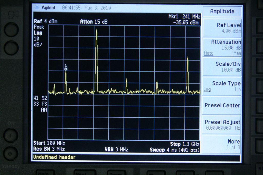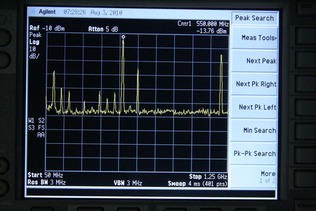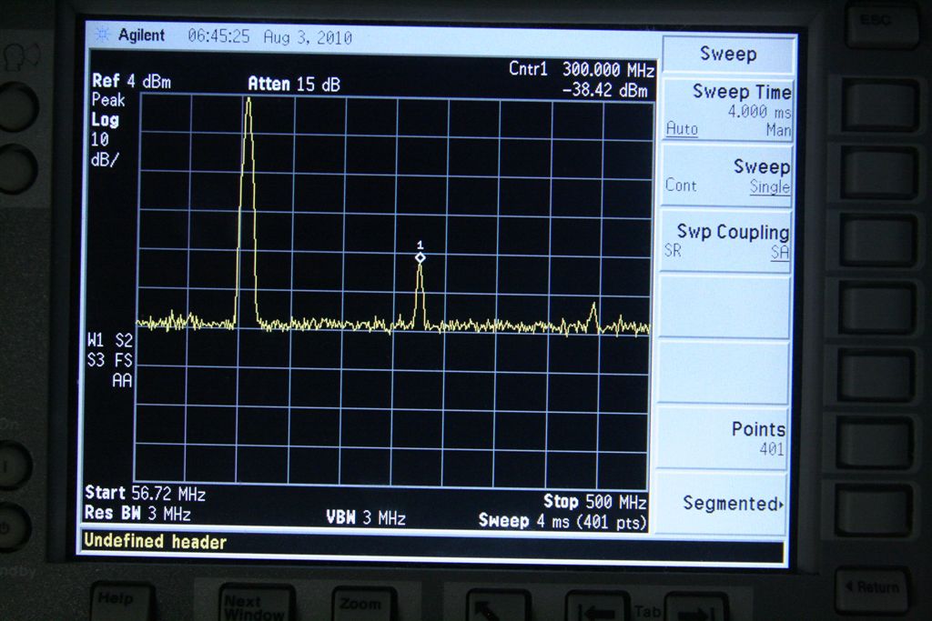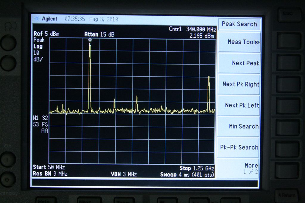 by zniknąć gdzieś w okolicach 340MHZ (pierwszy po prawej) - poniżej tej częstotliwości nie obserwowałem go w widmie, jak i w zasadzie żadnych innych niepożądanych prążków w widmie (poza harmonicznymi oczywiście):