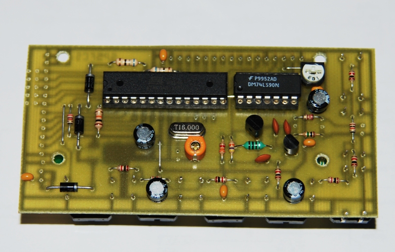 - na płytce mamy dzielnik częstotliwości przez 10 na 74LS90 dający szerszy zakres pomiarowy np. 30MHz, przy pomiarach VFO do 7MHZ możemy zrezygnować z dzielnika (zworka na podstawce), dla większych częstotliwości możemy dać inny, zewnętrzny preskaler max. do 256;