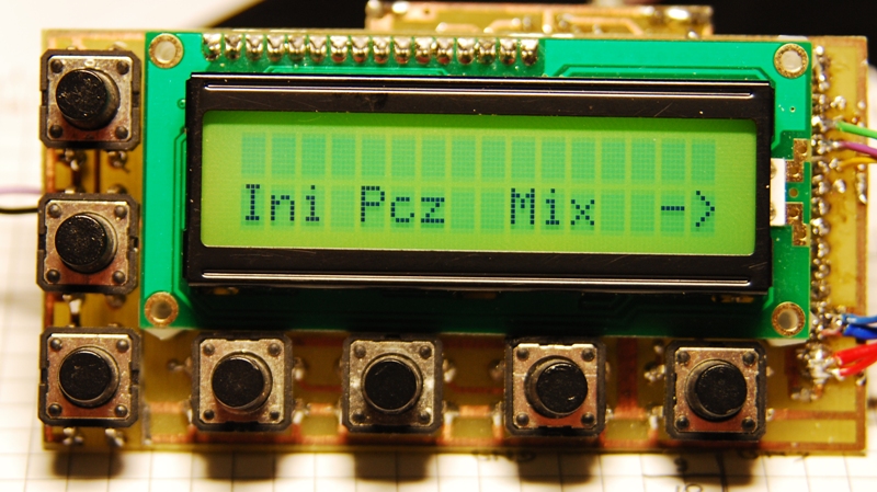 - aby wejść do MENU konfiguracji wciskamy lewy-górny klawisz i włączamy zasilanie modułu, wybieramy opcję INI aby zainicjować wstępne nastawy, tylko przy pierwszym włączeniu po zaprogramowaniu procesora;