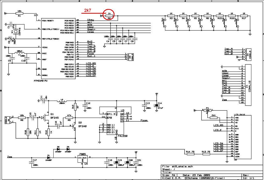 Na schemacie była zła wartość rezystora R2, ma być 2k7. Przy wartości 1 k źle rozpoznawał klawisze funkcyjne.