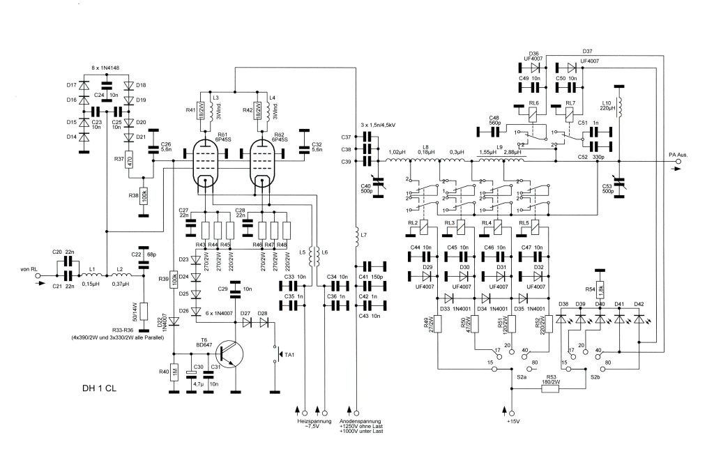 (28-12-2010 22:34)sp5cii napisał(a):  Schemat mojego do dziś pracującego wzmacniacza na 6P45C. Przy diodzie 4v7 S1 brakuje na schemacie kondensatora od 3.3nf-10nF do masy-S2,S3.Brak tej diody powoduje że prąd spoczynkowy jest powyżej 100-150mA w zależności od lamp. Z diodą wynosi ok 50mA dla dwóch lamp .Odłączenie diody przy odbiorze powoduje zablokowanie lampy minusem i nie występuje efekt śrutowy (szum w odbiorniku) na 21-28Mhz.