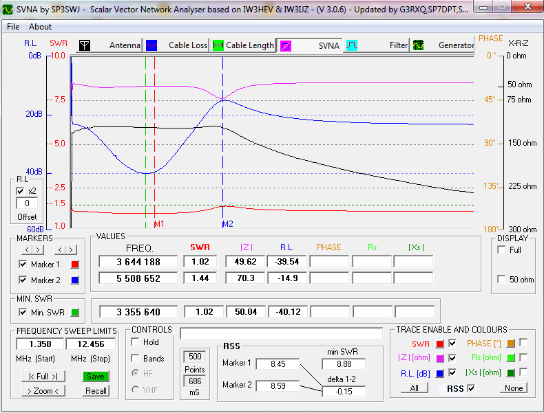Potencjometr jest dołączony tylko na czas pomiarów; aby dopasować impedancję filtra 10om do wyjścia VNA (w trybie wobuloskopu) 50om. SWR jest dobry bo jest dobre dopasowanie (ale miernika! nie tranzystora!). Nas najbardziej interesuje RSS czyli Radio Strange Signal-przepustowość filtra. Poziom sygnału trochę zafałszowany (PR wprowadza tłumienie) ale charakterystyka jest OK Big Grin