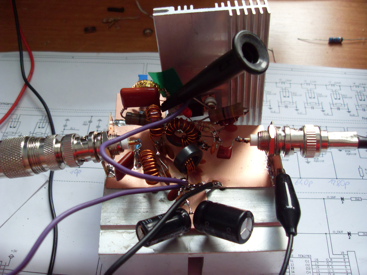 Jest to pierwszy etap tej konstrukcji. Wszystko w swoim czasie. Mam już przygotowaną pełną wersję tego schematu, która zawiera opornik w emiterze powodujący poprawienie pracy przedwzmacniacza. Ma on duży wpływ nie tylko na intermodulację, która jest najważniejszym parametrem wzmacniacza SSB, ale także na impedancję wejściową - łatwiej jest dopasować układ wzmacniacza do filtru pasmowego. NIestety poprawia on w wyraźny sposób tylko pracę przedwzmacniacza, ale nie całości razem.