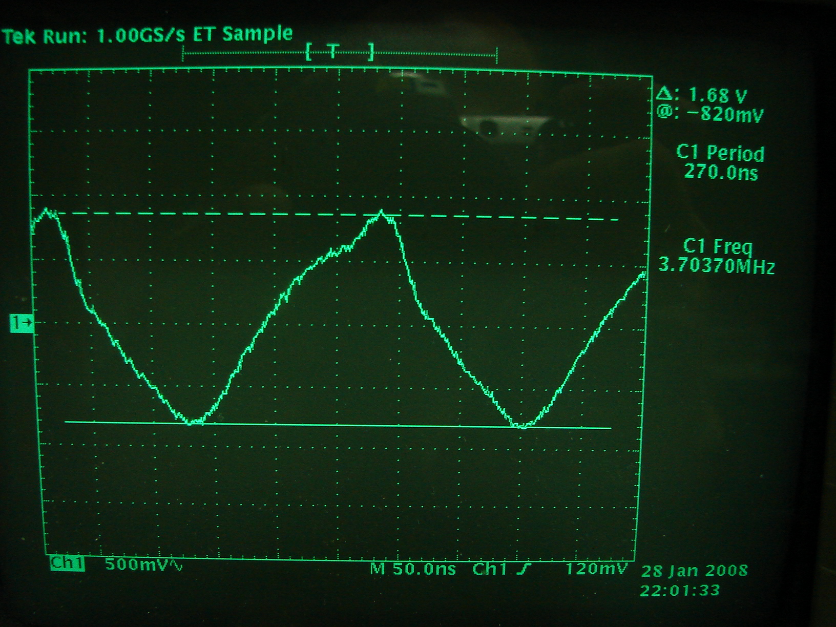 Przy mniejszej mocy przebieg sterujący bramkę mosfeta jest już bardziej do czegoś podobny: