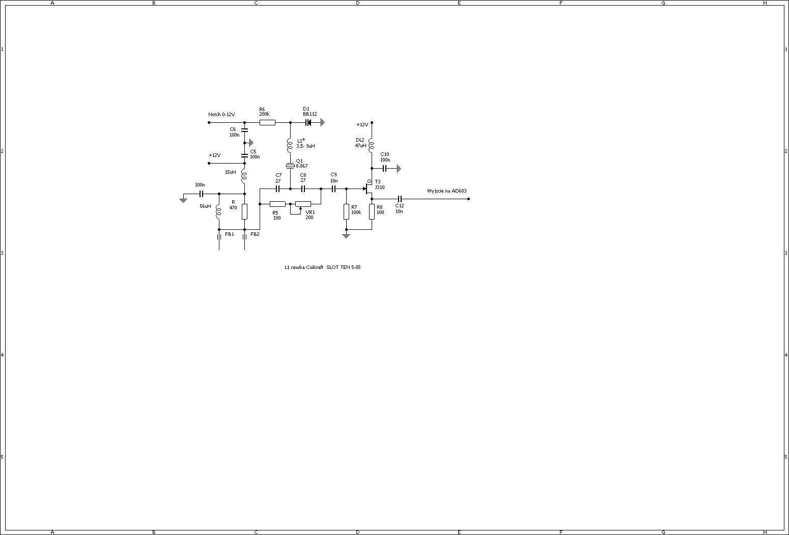 Układ Notcha został zaczerpnięty z projektu MiniYes. Jego atutem jest wycinanie niepożądanych sygnałów przed wzmacniaczem pośredniej częstotliwości, a przez to poprawienie pracy układu automatyki. Układ Notcha na wejściu obciążony jest opornością 500 Om, a na wyjściu 100kOm. Sygnał przechodząc przez połączone szeregowo kondensatory 27 pF jest tłumiony niską opornością rezonansu szeregowego Q1. Wartość częstotliwości rezonansu jest regulowana diodą pojemnościową BB112. Indukcyjność L1 ustala zakres jego przestrajania. Rezonator Q1 należy wybrać tak, aby miał możliwie największy odstęp (w górę) jego częstotliwości rezonansowej od częstotliwości górnego zbocza filtru. Pożądany odstęp to 500-1000 Hz. Im większa różnica tym indukcyjność L1 ma większą wartość, co poprawia: równomierność głębokości tłumienia w paśmie przestrajania i zakres przestrajania (jest większy). PRek VR1 ustala głębokość tłumienia notcha w środku pasma filtru. Mała indukcyjność L1 (np 3.5 uH) skutkuje zmniejszeniem tłumienia na obu krańcach przestrajania. Wszystko jest OK gdy L1 ma 7-8 uH (ale to zależy od różnicy częstotliwości Q1).
