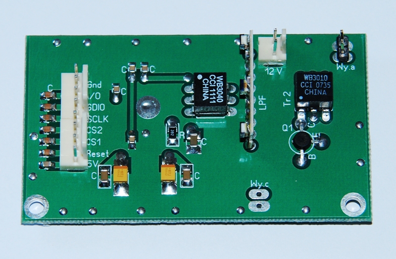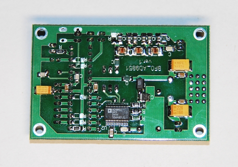 Kolejny moduł do Husara, generator VFO na DDS-e AD9951, zegar DDS-a 100MHz, fabryczny filtr dolnoprzepustowy 60MHz, stopień końcowy na tranzystorze BFR96. Na płytce jest miejsce na układ komparatora gdyby był potrzebny prostokąt na wyjściu syntezy.