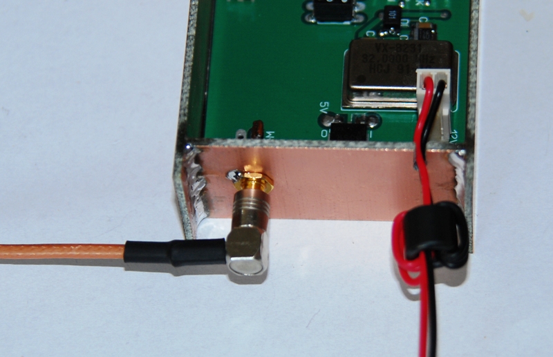 Na kolejnych zdjęciach moduł w ramce wykonanej z laminatu, wyjście sygnału złączem SMB, okablowanie poprzez otwory w ramce, masa płytki przylutowana punktowo do ramki.