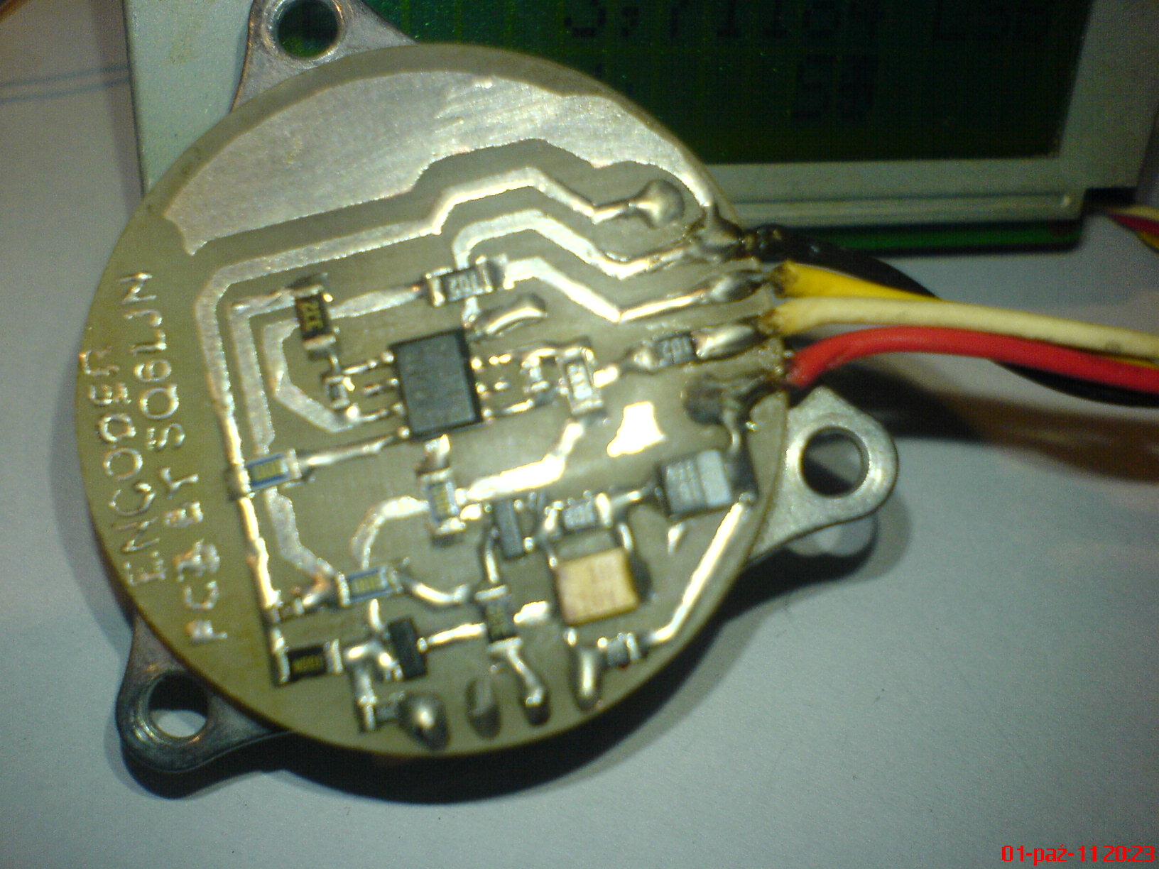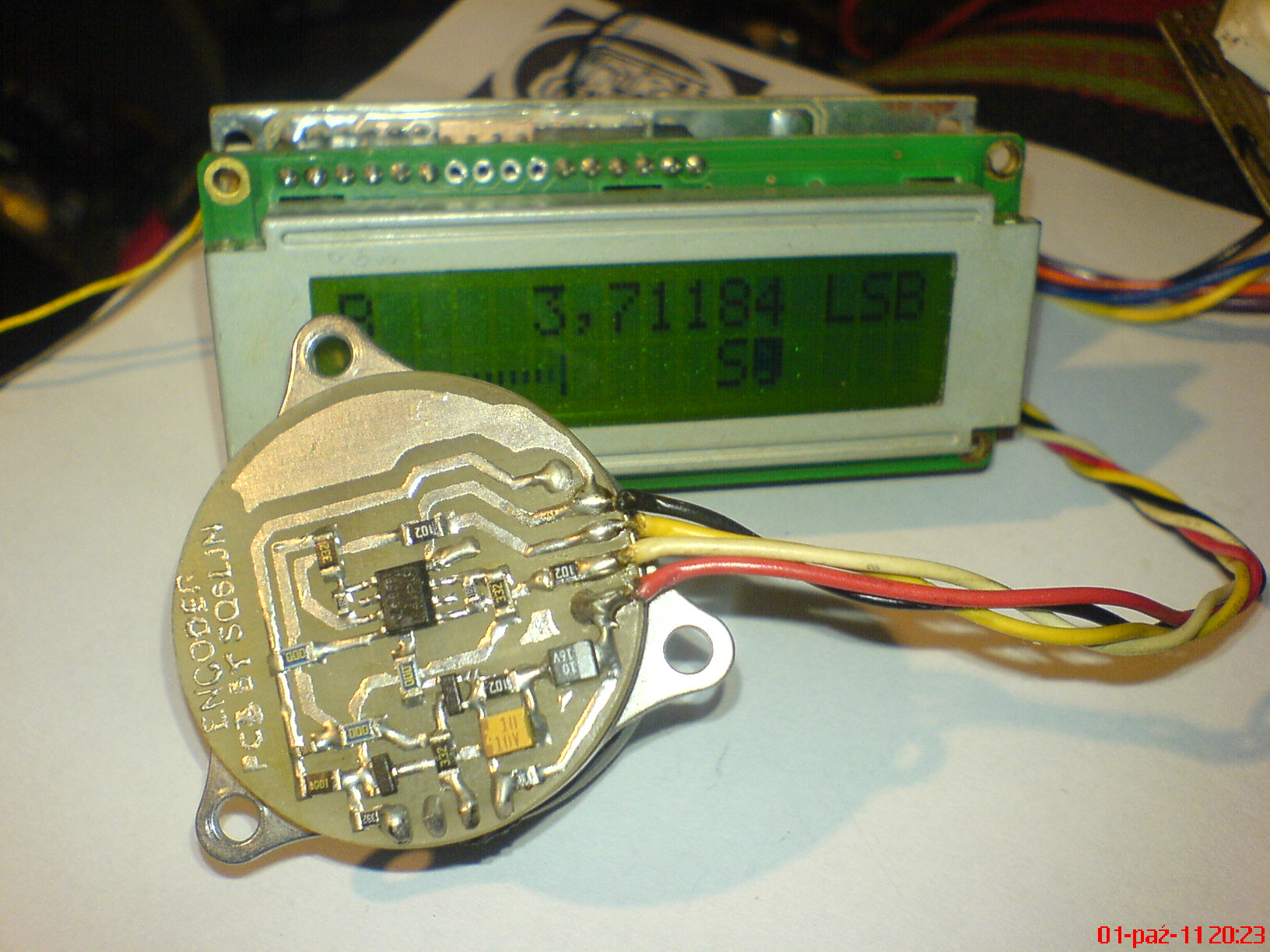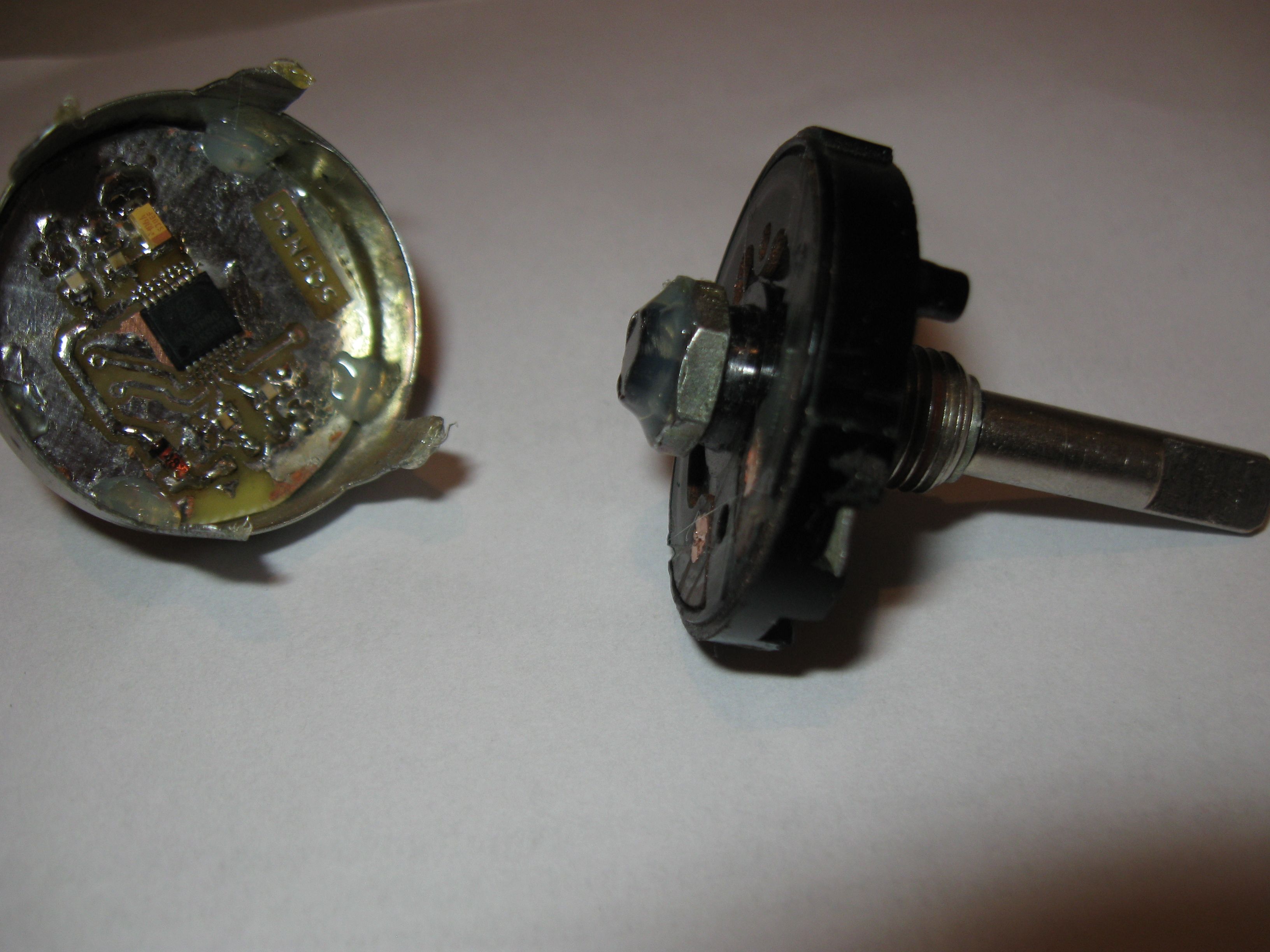 Poniższy enkoder jest na układzie AS5035 wg projektu Darka SQ8NBG. PCB idealnie spasowało się z obudową radzieckiego potencjometru. Jako, że nie mam zamiłowania do wszelkiego rodzaju prac ślusarskich i brak mi dostępu do chociażby porządnego imadła, jak zwykle wykonanie odbyło się "na kolanie" Smile Zapewniam jednak, że działa lepiej niż wygląda, chodzi płynnie i nie gubi impulsów z czego jestem bardzo zadowolony.