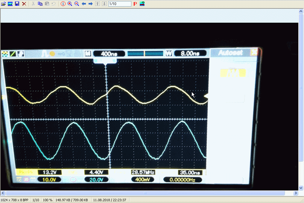 Ta w miarę dobra sinusoida to efekt trzech kondensatorów 120p+22p+22p PNP 1206 między Drenami.