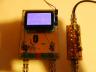 Ponieważ jest co pokazać to załączam zdjęcie jak będzie wygladał pomiar częstotliwości. Żródłem sygnału jest, widziany z lewej strony, generator TinyDDS a ekran pomiarowy tego trybu zawiera na dole skalę pomiarową (0-32MHz), pośrodku ekranu cyfrową wartość mierzonej częstotliwości oraz ponad skalą dynamicznie zmieniający się, poziomy słupek o długości proporcjonalnej do mierzonej częstotliwości.