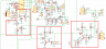 Na początek zacząłem montaż gniazd oraz wzmacniacza m.cz. Montowane elementy zaznaczyłem kolorem czerwonym. Nie ma potrzeby montować złącz J18 i J19. Układ wzmacniacza jest klasyczny, na uwagę może jedynie zasługiwać sekcja zbudowana z elementów: J7, R13, R16, R18, R19, C21, C26, C27, C29. To układ filtra dolnoprzepustowego kształtujący sygnał prostokątny monitora CW - z logiki transceivera, do postaci sygnału sinusa o odpowiednio wytłumionej amplitudzie doprowadzonego na wejście wzmacniacza m.cz. Dioda w obwodzie zasilania - D3, to dioda o prądzie 3A. Ponieważ zasilanie do nadajnika będzie prowadzone z płytki odbiornika to dlatego potrzebna jest tu dioda o podwyższonym prądzie. Diody D9 i D10 oraz inne diody nie działające w mieszaczach to diody typu smd 1N4148.