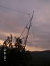 Po 3 latach użytkowania postanowiłem przestawić antenę . Z kiepsko działającego zygzaka zrobiłem książkową antenę rombową . Znów kosztowało mnie to 3 miesiące roboty bo w skład robót weszło przeróbka słupów , odchudzenie anteny o 6 kabli bo przy rozstawie ponad 40 metrów jednak ciągnie w dół , posunięcie anteny dalej od domu nie ze względu na pole w.cz. ale ze względów logistycznych , bo musiał się zmieścić tak , aby nie przeszkadzać w dojeździe do zajętej działki . Już lepiej działa , a jeszcze lepiej będzie jak założę balun . Na fotach widoczna antena po przekładce z dołożonym pionem na 28MHz i widok z sąsiedniej góry . Bardziej szczegółowy opis tu http://sp9krj.pl/photogallery.php?album_id=49 .